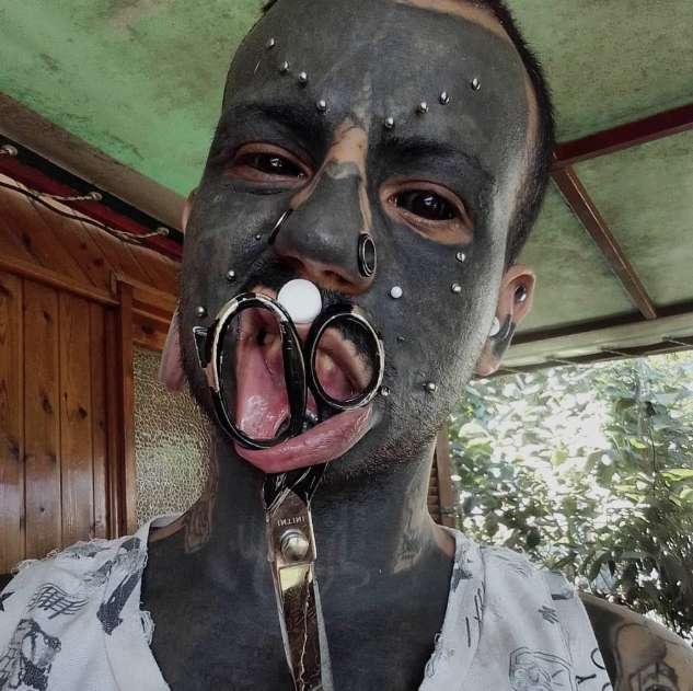 Στα 27 του χρόνια, ο Νικολό Σαβερίνο από την Απρίλια της Ιταλίας δεν μοιάζει με κανέναν άλλο — και ακριβώς έτσι το θέλει. Σε διάστημα μιας δεκαετίας, μετέτρεψε το σώμα του σε έναν ζωντανό καμβά. Σχεδόν το 70% του δέρματός του καλύπτεται από τατουάζ, η γλώσσα του είναι διχασμένη, και μικρά υποδερμικά εμφυτεύματα ξεπετάγονται κάτω από το δέρμα του σαν κέρατα. Τα αυτιά και το πρόσωπό του κοσμούνται με piercings και gauges, κάθε ένα μέρος της τέχνης που κουβαλά μαζί του κάθε μέρα.