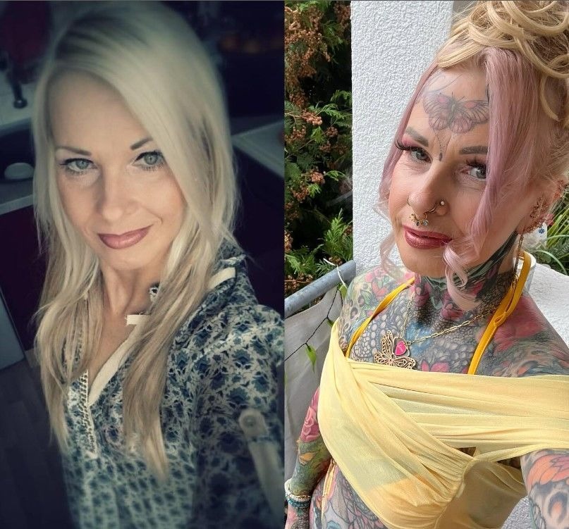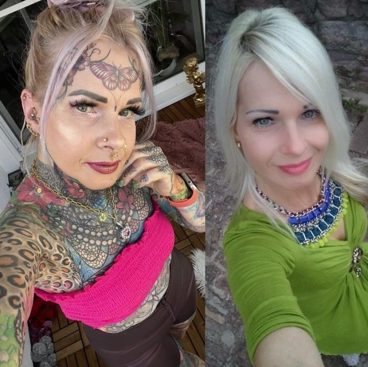 Στην πρώτη φωτογραφία εμφανίζεται χωρίς εμφανή τατουάζ και ντυμένη πιο συντηρητικά. Εννέα χρόνια αργότερα, τα χέρια, ο λαιμός, ο κορμός και ακόμη και το μέτωπό της είναι καλυμμένα με περίτεχνα σχέδια, ενώ φέρει πλέον πολλά σκουλαρίκια στη μύτη και στα αυτιά.