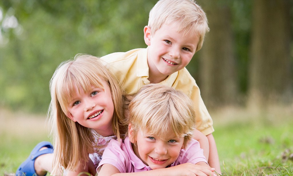 B3FB0K Three young children playing outdoors smiling