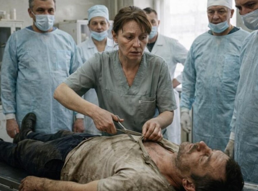 Την ίδια στιγμή, η καθαρίστρια Έβα, που κρατούσε τη σφουγγαρίστρα της, παρατήρησε τους πρησμένους λαιμικούς αγγειακούς ιστούς και την ασυμμετρία στο στήθος του άνδρα. Το σώμα του έκανε την τελευταία του αναλαμπή και η αναπνοή του κόπηκε ολοκληρωτικά. Χωρίς κανένα δισταγμό, πέταξε τη σφουγγαρίστρα και άρπαξε ένα κίτρινο κοπίδι από το τραπέζι. Σκίζοντας το βρώμικο πουκάμισό του, άρχισε καρδιοαναπνευστική αναζωογόνηση, πιέζοντας ρυθμικά με όλη της τη δύναμη και μετράει τα δευτερόλεπτα μέσα της.